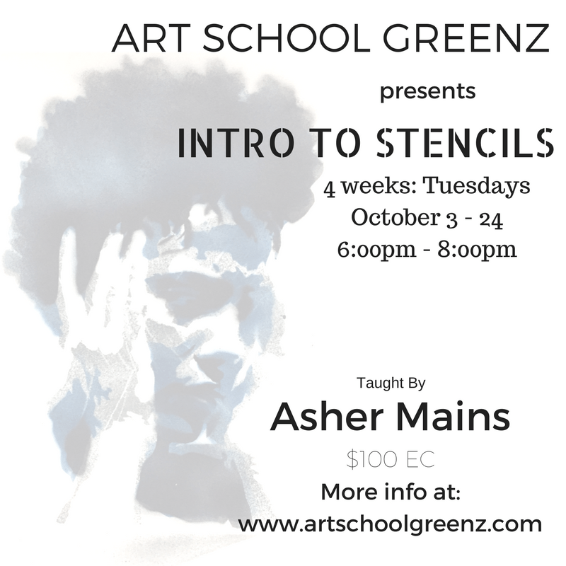 Intro to Stencils will be from 6:00pm to 8:00pm on Tuesdays at the Art School Greenz art room on Upper Lucas St. Art School Greenz shares space with the Berean Christian Academy campus.